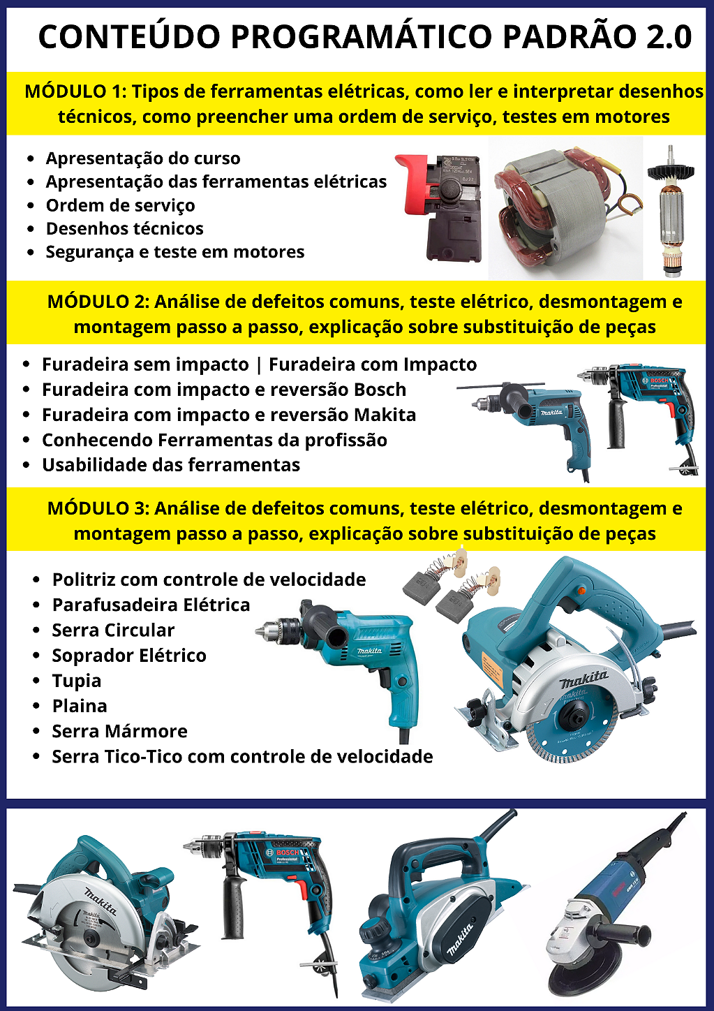 O curso de manutenção de ferramentas elétricas, foi elaborado com o intuito de ensinar do zero a pessoa que não possui conhecimento na área de manutenção de ferramentas elétricas. Com um curso objetivo por meio de vídeo aulas e apostilas, o aluno consegue aprender a profissão e ao final do terceiro módulo, já pode começar a trabalhar. As ferramentas que o aluno aprenderá a dar manutenção e a grade do curso estão descritas abaixo.